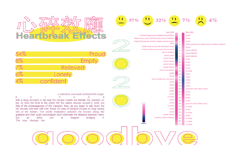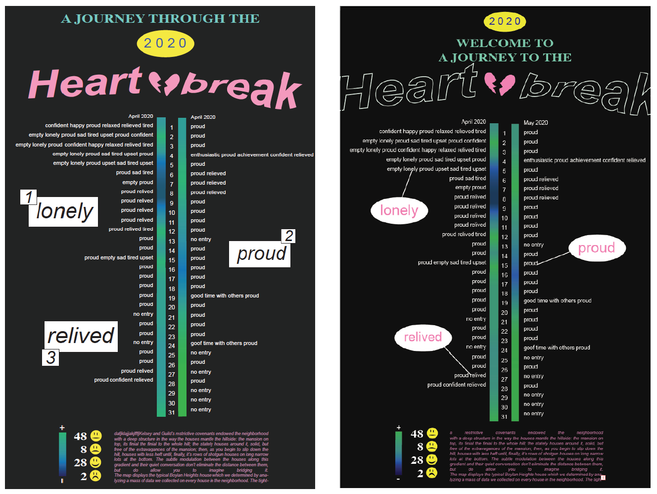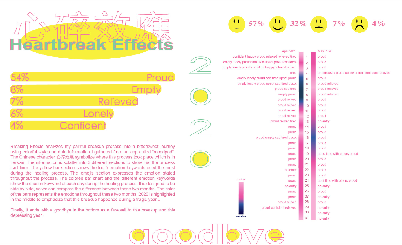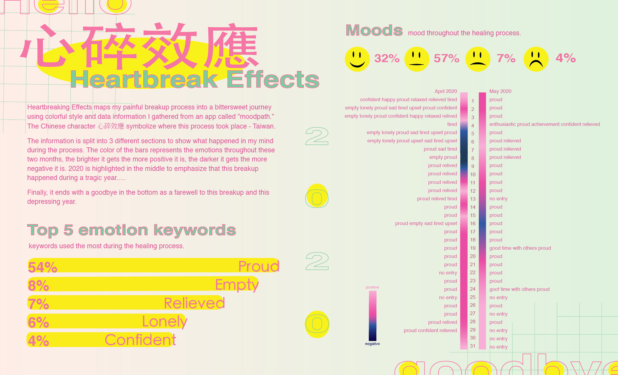 WOW! It was a very emotional and intimate project for me because I presented my own feelings and thoughts to everyone in the class and on the internet. I was not so sure if I should have done it, but making it the topic for this project really helped me understand how far I have come after this heartbreak. I now understand how powerful infographic is and what it can do with some invisible information.