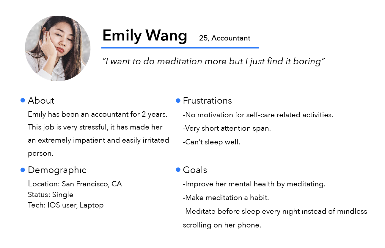 Most of the avaliable meditating apps are too informative and too long to keep people interested. There are not many fun interactions between the users and the app thus no motivation for the users to keep on using. It does not give many feedbacks or reactions which lower the user’s interest level. In the end, most people find it hard to countinue. As a result, gives up on meditation.
