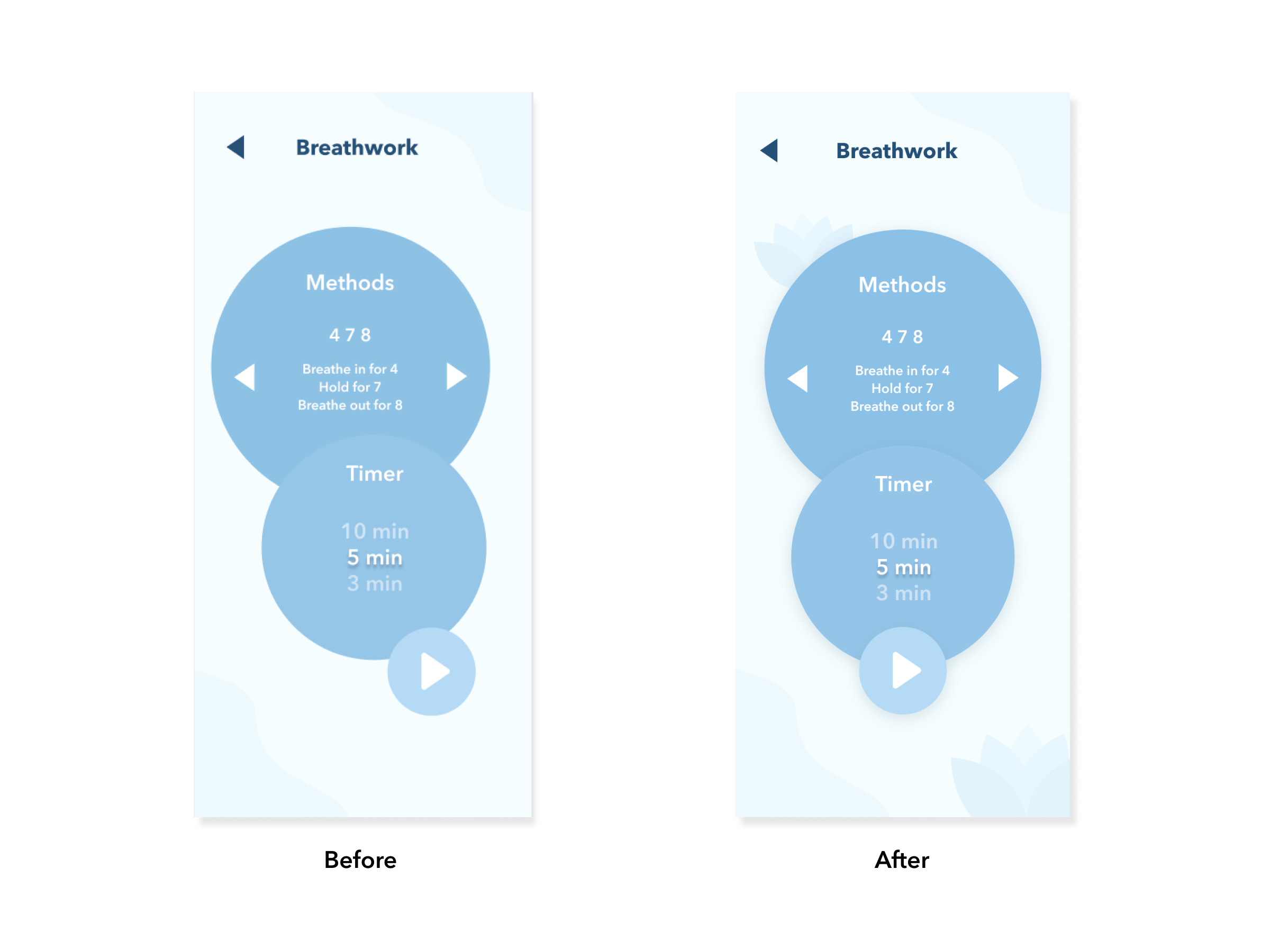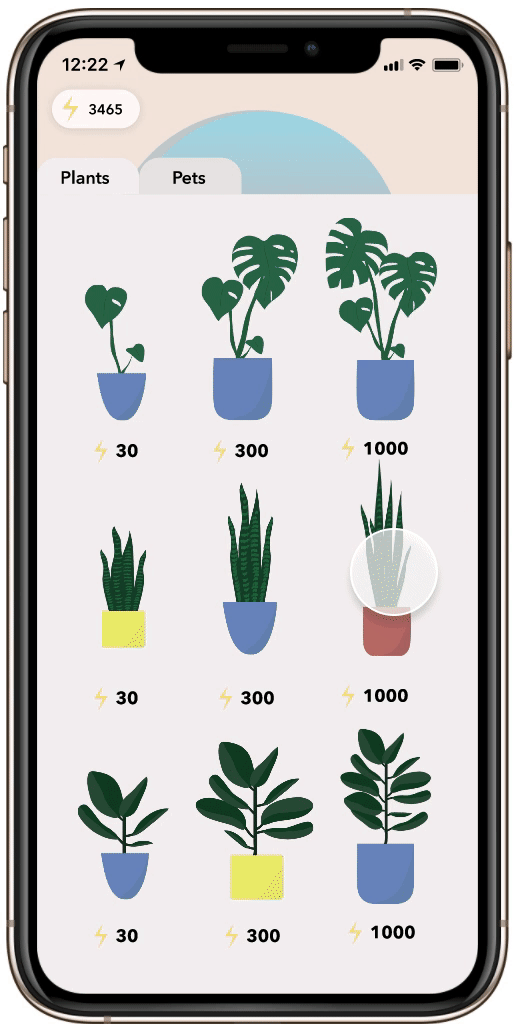 On the other hand, if the users forgot to return to the app the plants would die, the pets would starve. Additionally, to prevent the users from overdoing the meditation for the sole purpose of gaining the energies to feed pets and plants, I set a maximum limit of meditations that can be performe.